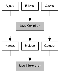 Wie die Abbildungen deutlich machen, spielen die .class-Files für den Entwicklungsprozeß und die Portierbarkeit von Java-Programmen eine entscheidende Rolle. Jede .class-Datei enthält den Bytecode für eine übersetzte Klasse. Zusätzlich sind in ihr Informationen enthalten, um dynamisches Linken und Late-Bindung zu unterstützen und gegebenenfalls Symbole, Zeilennummern und andere Informationen für den Debugger zur Verfügung zu stellen.
