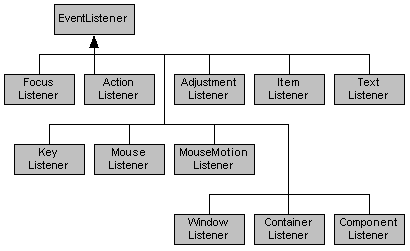 Jede der Methoden eines Listener-Interfaces enthält als einziges Argument ein Objekt vom zugehörigen Ereignistyp. Alle Methoden sind vom Typ void, erzeugen also keinen Rückgabewert. Dies steht in strengem Kontrast zu den Ereignishandlern des AWT 1.0, bei denen der Rückgabewert darüber entschieden hat, ob das Ereignis in der Vererbungshierarchie weiter nach oben gereicht werden sollte oder nicht. Im AWT 1.1 werden Ereignisse dagegen grundsätzlich nicht automatisch weitergereicht. |