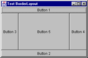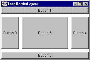 Das folgende Beispiel zeigt die Anordnung von fünf Buttons in einem BorderLayout. Jeweils einer der Buttons wird auf die vier Randbereiche verteilt, und der fünfte Button steht in der Mitte. Die Größe des Fensters wird fest auf 300*200 Pixel eingestellt: