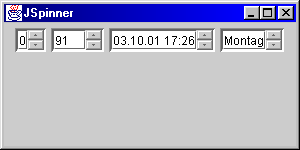 Seit dem JDK 1.4 gibt es die Klasse JSpinner, mit der Textfelder erzeugt werden können, deren Inhalt einer vordefinierten, geordneten Liste von Werten entstammt. Diese Werte können vom Anwender nicht nur manuell eingegeben werden, sondern auch auf- oder absteigend durchlaufen werden. Dazu besitzt der JSpinner zwei kleine Buttons, mit denen die Wertefolge abgerufen werden kann. Alternativ können meist auch die Tasten [CURSORHOCH] oder [CURSORRUNTER] verwendet werden, wenn der JSpinner den Fokus hat. |