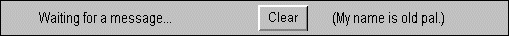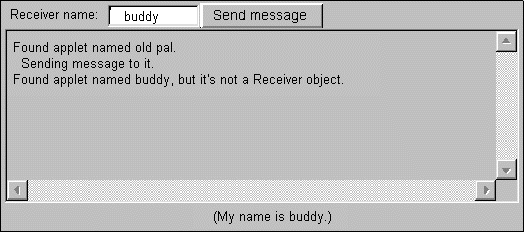 Try this: Click the Send message button of the top applet (the Sender). Some status information will appear in the Sender's window, and the Receiver will confirm (with its own status string) that it received a message, After you've read the Receiver status string, press the Receiver's Clear button to reset the Receiver. In the Sender's text field labeled "Receiver name:," type inbuddyand press Return. Since "buddy" is the Sender's own name, the Sender will find an applet named buddy but won't send it a message, since it isn't a Receiver instance.Here's the