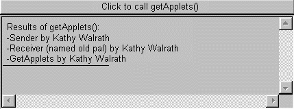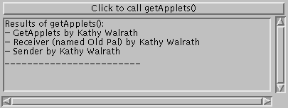 public void printApplets() { //Enumeration will contain all applets on this page (including //this one) that we can send messages to. Enumeration e = getAppletContext().getApplets(); . . . while (e.hasMoreElements()) { Applet applet = (Applet)e.nextElement(); String info = ((Applet)applet).getAppletInfo(); if (info != null) { textArea.appendText("- " + info + "\n"); } else { textArea.appendText("- " + applet.getClass().getName() + "\n"); } } . . . }