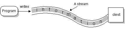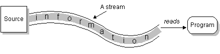 To bring in information, a program opens a stream on an information source (a file, memory, a socket) and reads the information sequentially, as shown here:Similarly, a program can send information to an external destination by opening a stream to a destination and writing the information out sequentially, like this: No matter where the data is coming from or going to and no matter what its type, the algorithms for sequentially reading and writing data are basically the same: The