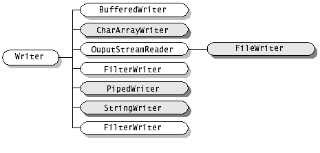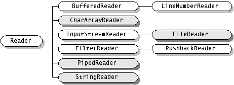 java.io.Readerprovides the API and partial implementation for readers--streams that read 16-bit characters--andWriterprovides the API and partial implementation for writers--streams that write 16-bit characters. Subclasses ofReaderandWriterimplement specialized streams and are divided into two categories: those that read from or write to data sinks (shown in gray in the following figures) and those that perform some sort of processing (shown in white). The figure shows the class hierarchies for theReaderandWriterclasses.Most programs should use readers and writers to read and write textual information. The reason is that they can handle any character in the Unicode character set, whereas the byte streams are limited to ISO-Latin-1 8-bit bytes.