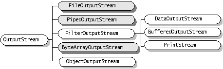 ReaderandWriter, subclasses ofInputStreamandOutputStreamprovide specialized I/O that falls into two categories, as shown in the following class hierarchy figure: data sink streams (shaded) and processing streams (unshaded).