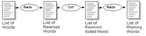 With pipe streams, the output from one method could be piped into the next, as shown in this figure: Let's look at a program, called RhymingWords, that implements what's represented in the previous figure. This program uses