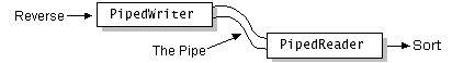 reversemethod; thesortmethod is similar and you will understand it once you understandreverse.The statements in boldface create both ends of a pipe--apublic static Reader reverse(Reader src) throws IOException { BufferedReader in = new BufferedReader(source); PipedWriter pipeOut = new PipedWriter(); PipedReader pipeIn = new PipedReader(pipeOut); PrintWriter out = new PrintWriter(pipeOut); new ReverseThread(out, in).start(); return pipeIn; }PipedWriterand aPipedReader-- and connect them by constructing thePipedReader"on" thePipedWriter. Whatever is written to thePipedWritercan be read from thePipedReader. The connection forms a pipe, as illustrated here:The reversemethod starts aReverseThreadthat writes its output to the