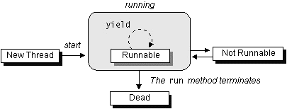startmethod has returned, the thread is "running". Yet, it's somewhat more complex than that. As the previous figure shows, a thread that has been started is actually in the Runnable state. Many computers have a single processor, thus making it impossible to run all "running" threads at the same time. The Java runtime system must implement a scheduling scheme that shares the processor between all "running" threads. (See Understanding Thread Priority for more information about scheduling.) So at any given time, a "running" thread actually may be waiting for its turn in the CPU.Here's another look at
