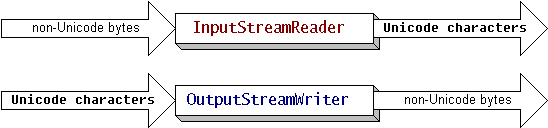 InputStreamReaderandOutputStreamWriterobjects, you specify the byte encoding that you want to convert. For example, to translate a text file in the UTF-8 encoding into Unicode, you create anInputStreamReaderas follows:FileInputStream fis = new FileInputStream("test.txt"); InputStreamReader isr = new InputStreamReader(fis, "UTF8");If you omit the encoding identifier,