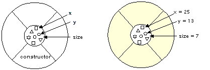The first line shown declares a variable namedprivate Spot spot = null; private static final int RADIUS = 7; ... spot = new Spot(RADIUS);spotwhose data type isSpot, the class from which the object is created, and initializes the variable tonull. The second line declares an integer variable namedRADIUSwhose value is7. Finally, the last line shown creates the object;newallocates memory space for the object.Spot(RADIUS)calls the constructor you saw previously and passes in the value ofRADIUS. Thus the spot object'ssizeis set to 7The figure on the left is a representation of the Spotclass. The figure on the right is a spot object.