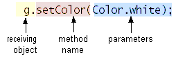 ClickMeapplet:Both are messages from the applet to an object namedg.setColor(Color.white); g.fillRect(0, 0, getSize().width - 1, getSize().height - 1);g--aGraphicsobject that knows how to draw simple on-screen shapes and text. This object is provided to the applet when the browser instructs the applet to draw itself. The first line sets the color to white; the second fills a rectangle the size of the applet, thus painting the extent of the applet's area white.The following figure highlights each message component in the first message: