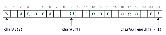 You can get the character at a particular index within a string or a string buffer by using thecharAtaccessor. The index of the first character is 0; the index of the last islength()-1. For example, the following code gets the character at index 9 in a string:Indices begin at 0, so the character at index 9 is 'O', as illustrated in the following figure:String anotherPalindrome = "Niagara. O roar again!"; char aChar = anotherPalindrome.charAt(9);Use the charAtmethod to get a character at a particular index. The figure also shows that to compute the index of the last character of a string, you have to subtract 1 from the value returned by thelengthmethod.If you want to get more than one character from a string or a string buffer, you can use the