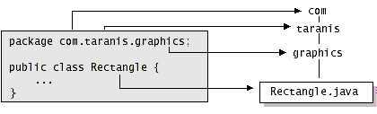 taranis.comwould precede all its package names withcom.taranis. Each component of the package name corresponds to a subdirectory. So if Taranis had agraphicspackage that contained aRectangle.javasource file, it would be contained in a series of subdirectories, as shown below.
