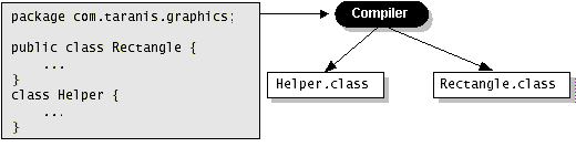 When you compile a source file, the compiler creates a different output file for each class and interface defined in it. The base name of the output file is the name of the class or the interface, and its extension is