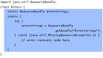 Here's an example of a static initialization block:The errorStringsresource bundle must be initialized in a static initialization block. This is because error recovery must be performed if the bundle cannot be found. Also,errorStringsis a class member and it doesn't make sense for it to be initialized in a constructor. As the previous example shows, a static initialization block begins with thestatickeyword and is a normal block of Java code enclosed in curly braces {}.A class can have any number of static initialization blocks that appear anywhere in the class body. The runtime system guarantees that static initialization blocks and static initializers are called in the order (left-to-right, top-to-bottom) that they appear in the source code.