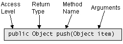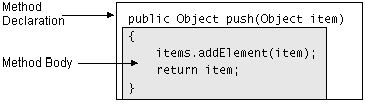 This figure shows the code forStack's push method. This method pushes an object, the one passed in as an argument, onto the top of the stack, and returns it.Like a class, a method has two major parts: method declaration and method body. The method declaration defines all of the method's attributes, such as access level, return type, name, and arguments, as illustrated here: The method body is where all the action takes place. It contains the Java instructions that implement the method.