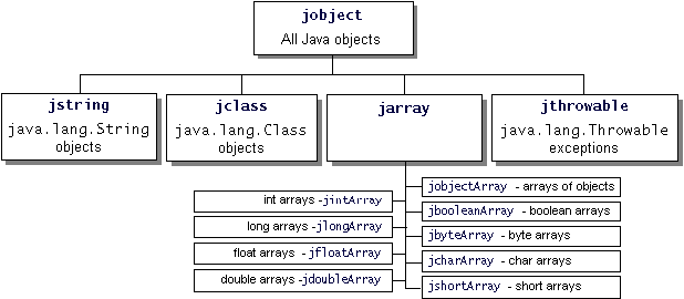 type jobject. For convenience and to avoid programming errors, the JNI implements a set of types that are conceptually all subclassed from (or are "subtypes" of) jobject, as follows: