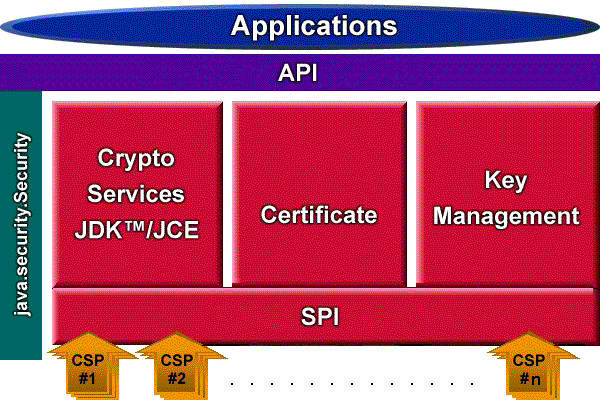 The following figure illustrates the various JCA modules. The SPI (service provider interface) layer, representing methods that must be implemented by cryptographic service providers, is described in the following section.