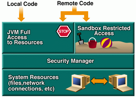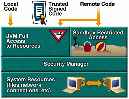 The original security model provided by the Java platform, known as the "sandbox" model, existed in order to provide a very restricted environment in which to run untrusted code obtained from the open network. In the sandbox model, shown in the following diagram, local code is trusted to have full access to vital system resources, such as the file system, but downloaded remote code (an applet) is not trusted and can access only the limited resources provided inside the sandbox. A security manager is responsible in this and subsequent platforms for determining which resource accesses are allowed.