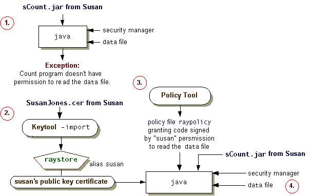 Now act as Ray, who receives the signed JAR file and the certificate file from Susan. You will perform the following steps, as shown in the figure.