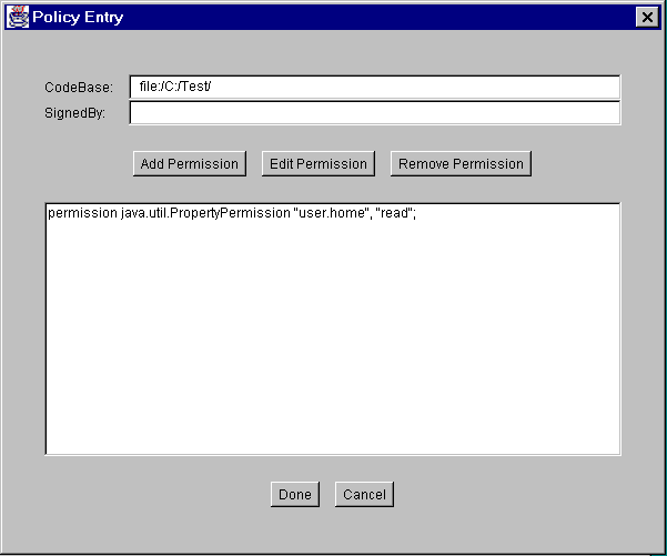 Click the image to view it at its natural size.You are now done specifying this policy entry, so choose the Done button in the Policy Entry dialog. The Policy Tool window now includes a line representing the new policy entry, showing the CodeBase value.