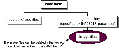 Note: Applets are supposed to be able to load images from JAR files. Currently, however, some browsers can't read images from a JAR file, although they do successfully get classes from a JAR file. With our applets, we currently hedge our bets by both putting the image files in the applet's archive file (the JAR file containing the applet's class files) and by putting the image files in the file system on the server. The figure above depicts our setup.