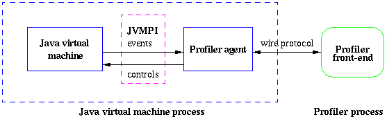 The profiler front-end may or may not run in the same process as the profiler agent. It may reside in a different process on the same machine, or on a remote machine connected via the network. The JVMPI does not specify a standard wire protocol. Tools vendors may design wire protocols suitable for the needs of different profiler front-ends.