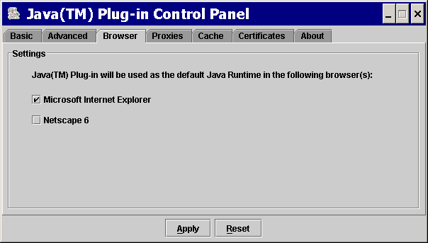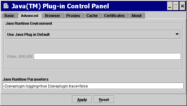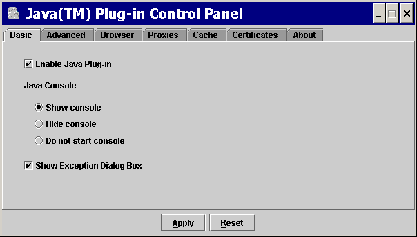 The JavaTM Plug-in Control Panel enables you to change the default settings used by the Java Plug-in at startup. All applets running in an active instance of Java Plug-in use these settings.