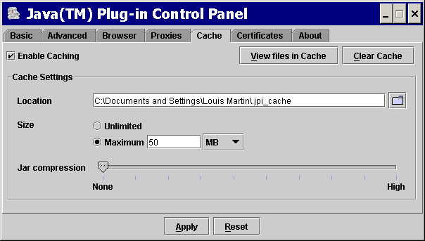 NoteThe cache referred to here is the sticky cache; i.e., the disk cache created and controlled by Java Plug-in which the browser cannot overwrite. See Applet Caching. |