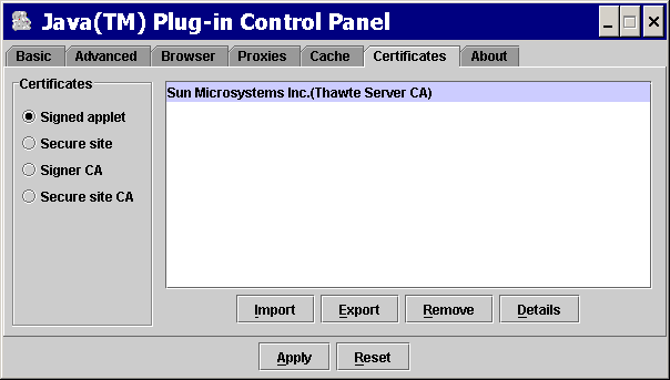 For Signed applet and Secure site certificates, there are four options: Import, Export, Remove, and Detail. The user can import, export, remove and view the details of a certificate.