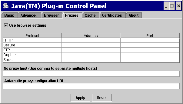 Use the Proxies panel to use the browser default settings or to override the proxy address and port for the different protocols.