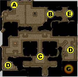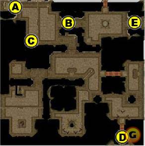 The guardian on this level requires a password. You will find it ("Thurth mog lama gat rag") by reading the creator scroll locked in a heavily guarded chest in the southern area of the level. When you open the chest, you will be attacked by three 13th-level flesh golems.