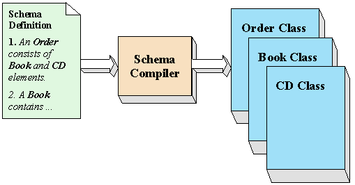 In essence, data binding operates by "compiling" a schema specification to produce Java classes, as shown here: