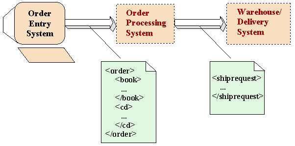 In this example, the order taking system could be a server application or a client-side application. It encodes the purchaser's order in XML and sends it to the order-processing server, which may route shipping requests (again, encoded in XML) to a remote warehouse. For some products, the "warehouse" might be a third-party manufacturer that fills orders on demand. In such cases, the XML format for data transmission may become virtually mandatory as we move forward into the next century.