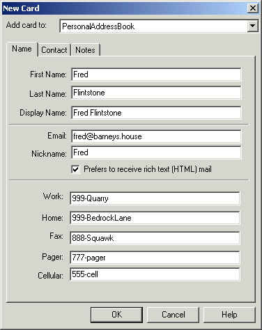 nickname: Fred email: Fred@barneys.house html: TRUE firstname: Fred lastname: Flintstone work: 999-Quarry home: 999-BedrockLane fax: 888-Squawk pager: 777-pager cell: 555-cell