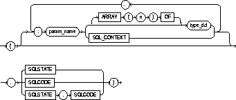 You can place the SQLSTATE and/or the SQLCODE status parameters anywhere in the parameter list; they are conventionally shown at the end of the parameter list in this Guide, as indicated in this syntax diagram. You must include either SQLSTATE (recommended) or SQLCODE (for backward compatibility with SQL89). You can include both, in any order. Do not place a colon before the status parameter, and do not include a datatype after it.