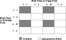 Each of the five characters in a SQLSTATE value is a digit (0..9) or an uppercase Latin letter (A..Z). Class codes that begin with a digit in the range 0..4 or a letter in the range A..H are reserved for the predefined conditions (those defined in the SQL92 specification). All other class codes are reserved for implementation-defined sub-conditions. All other subclass codes are reserved for implementation-defined sub-conditions. Figure 4-1 shows the coding scheme.