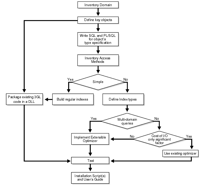 The direction you take at the choice point results from the simplicity or complexity of the access methods you need to deploy, which in turn derives from the nature of the data as represented by columns in the table. If you the methods you need to query your data are relatively simple, you can build regular indexes. By contrast, dealing with complex data means you will need to define complex index types as the basis for making use of Oracle's extensible indexing technology. If you are in addition faced with implementing multi-domain queries, you should choose to make use of Oracle's extensible optimizer technology.