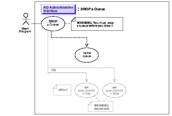 /* Stop the queue preparatory to dropping it (a queue may be dropped only after it has been succesfully stopped for enqueing and dequeing): */ EXECUTE dbms_aqadm.stop_queue ( Queue_name => 'aq.Msg_queue'); /* Drop queue: */ EXECUTE dbms_aqadm.drop_queue ( Queue_name => 'aq.Msg_queue');