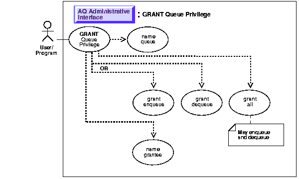 To grant privileges on a queue to users and roles. The privileges are ENQUEUE or DEQUEUE. Initially, only the queue table owner can use this procedure to grant privileges on the queues.