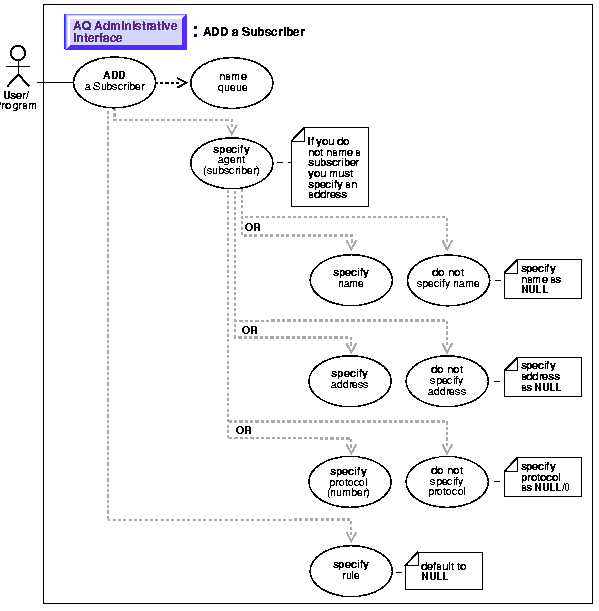 DECLARE subscriber sys.aq$_agent; BEGIN subscriber := sys.aq$_agent('East_Shipping','ES.ES_bookedorders_que',null); DBMS_AQADM.ADD_SUBSCRIBER( queue_name => 'OE.OE_bookedorders_que', subscriber => subscriber, rule => 'tab.user_data.orderregion = ''EASTERN'' OR (tab.user_data.ordertype = ''RUSH'' AND tab.user_data.customer.country = ''USA'') '); END;