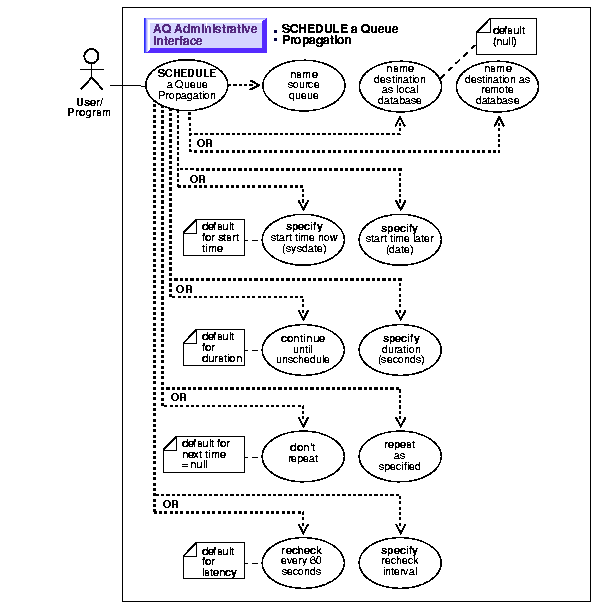 /* Schedule a propagation from queue aq.q1def to other queues in another database */ EXECUTE DBMS_AQADM.SCHEDULE_PROPAGATION( Queue_name => 'aq.q1def', Destination => 'another_db.world');