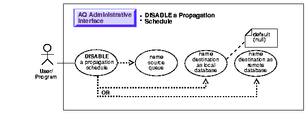 /* Disable a propagation from queue aq.q1def to other queues in the same database */ EXECUTE DBMS_AQADM.DISABLE_PROPAGATION_SCHEDULE( Queue_name => 'aq.q1def');