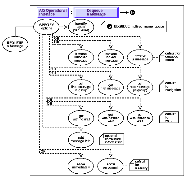 /* Dequeue a message for subscriber1 in browse mode*/ public static void example(AQSession aq_sess) throws AQException, SQLException { AQQueue queue; AQMessage message; AQRawPayload raw_payload; AQDequeueOption deq_option; byte[] b_array; Connection db_conn; db_conn = ((AQOracleSession)aq_sess).getDBConnection(); queue = aq_sess.getQueue ("aq", "priority_msg_queue"); /* Create a AQDequeueOption object with default options: */ deq_option = new AQDequeueOption(); /* Set dequeue mode to BROWSE */ deq_option.setDequeueMode(AQDequeueOption.DEQUEUE_BROWSE); /* Dequeue messages for subscriber1 */ deq_option.setConsumerName("subscriber1"); /* Dequeue a message: */ message = queue.dequeue(deq_option); System.out.println("Successful dequeue"); /* Retrieve raw data from the message: */ raw_payload = message.getRawPayload(); b_array = raw_payload.getBytes(); db_conn.commit(); }