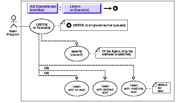 /* The listen call allows you to monitor a list of queues for messages for specific agents. You need to have dequeue privileges for all the queues you wish to monitor. */
