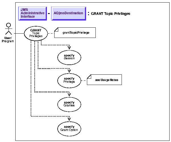 See Java (JDBC): Oracle8i Supplied Java Packages Reference, oracle.jms, AQjmsDestination.grantTopicPrivilege