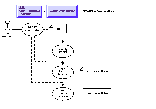 After creating a destination, the administrator must use the start method to enable the destination. If Enable Enqueue is set to TRUE, then the destination is enabled for enqueue. If Enable Enqueue is set to FALSE, then the destination is disabled for enqueue. Similarly, if Enable Dequeue is set to TRUE, then the destination is enabled for dequeue. If Enable Dequeue is set to FALSE, the destination is disabled for dequeue.