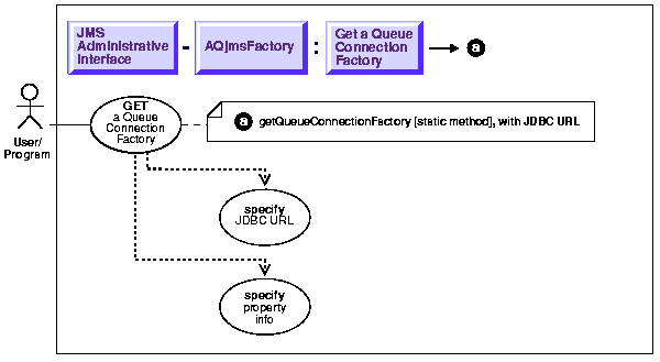 See Java (JDBC): Oracle8i Supplied Java Packages Reference, oracle.jms, AQjmsFactory.getQueueConnectionFactory
