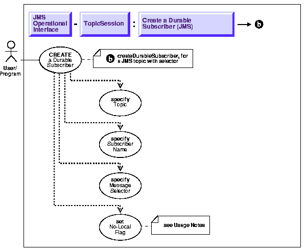 The client creates a durable subscriber by specifying a subscriber name and JMS topic. Optionally, a message selector can be specified. Only messages with properties matching the message selector expression are delivered to the subscriber. The selector value may be null. The selector can contain any SQL92 expression which has a combination of one or more of the following: