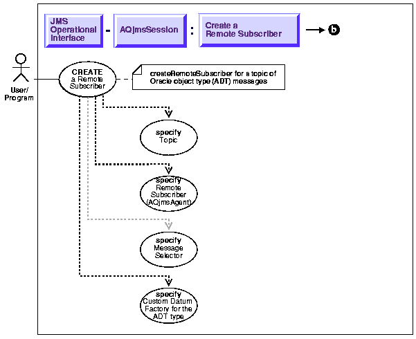 TopicConnectionFactory tc_fact = null; TopicConnection t_conn = null; TopicSession t_sess = null; TopicSession jms_sess; TopicSubscriber subscriber1; Topic shipped_orders; int my[port = 5521; AQjmsAgent remoteAgent; ADTMessage message; /* create connection and session */ tc_fact = AQjmsFactory.getTopicConnectionFactory("MYHOSTNAME", "MYSID", myport, "oci8"); t_conn = tc_fact.createTopicConnection("jmstopic", "jmstopic"); /* create Topic session */ jms_sess = t_conn.createTopicSession(true, Session.CLIENT_ACKNOWLEDGE); /* get the Shipped order topic */ shipped_orders = ((AQjmsSession )jms_sess).getTopic("OE", "Shipped_Orders_ Topic"); /* create a remote agent */ remoteAgent = new AQjmsAgent("WesternRegion", "WS.shipped_orders_topic", null); /* create a remote subscriber with null selector*/ subscriber1 = ((AQjmsSession)jms_sess).createRemoteSubscriber(shipped_orders, remoteAgent, null, message.getFactory);